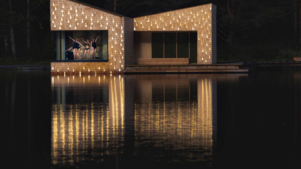 Where it sits matters as much as what it looks like. Much of this shoreline is shallow, so the sauna is positioned along a deeper inlet and lifted on stilts. A long wooden walkway reaches out over the water to the building, turning the approach into part of the experience. It feels like a short pier-walk that slows you down, separating everyday land movement from the ritual of heat, water, and views.