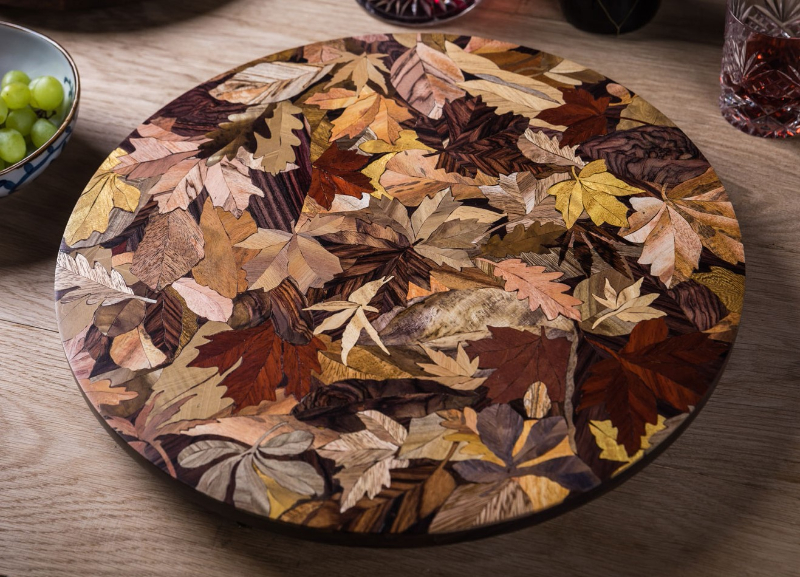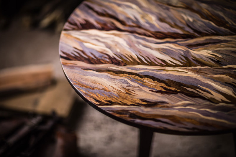 What makes the results feel unusually “alive” is the way the imagery comes from timber itself. The colours are not painted on – the natural colour and grain of each species carries the tones, and fine engraving can be used to sharpen detail and bring out lines. The approach gives his designs a tactile depth that reads differently from flat veneer work, especially when light catches varied grain directions across neighbouring pieces.