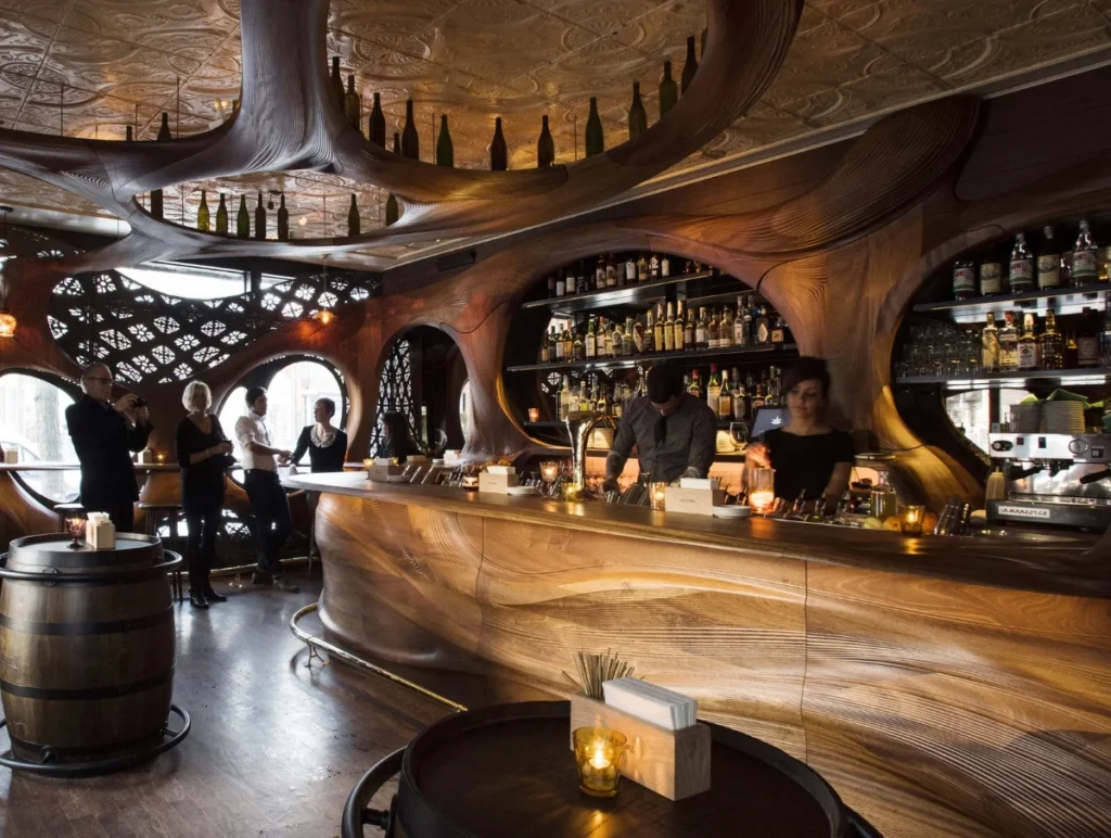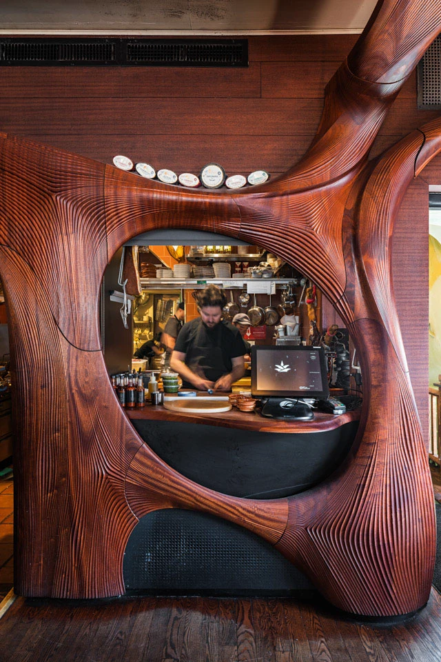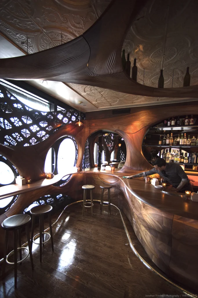 Partisans answered with a single bold move – a continuous carved interior that wraps the space. The bar, walls, and ceiling merge into one flowing surface made from dark mahogany. In a compact footprint, that decision changes everything. The room stops feeling like a typical box with furniture inside it. Instead, it becomes an immersive environment, almost like stepping into a sculpted object.