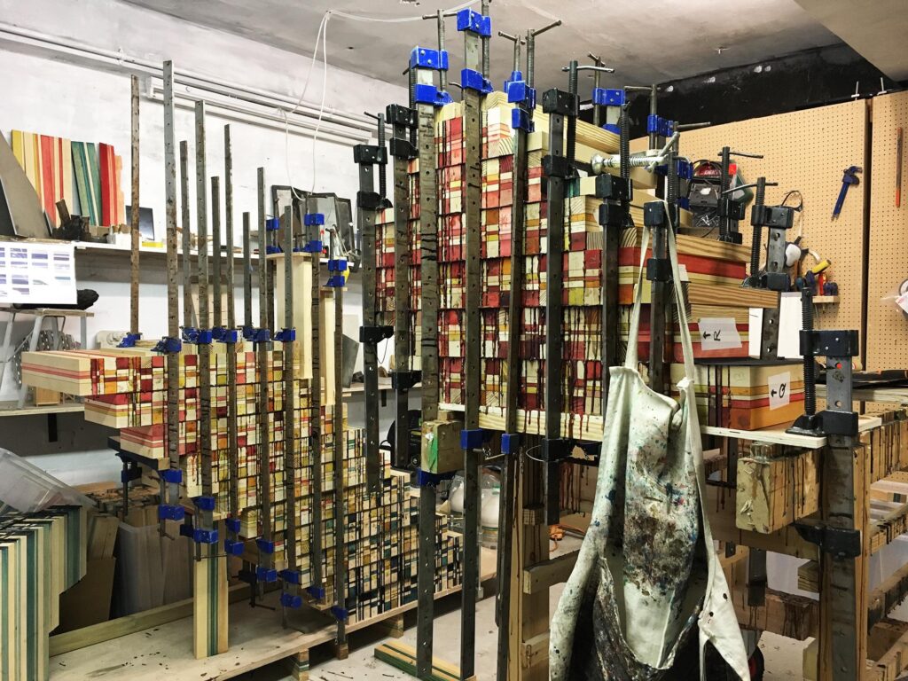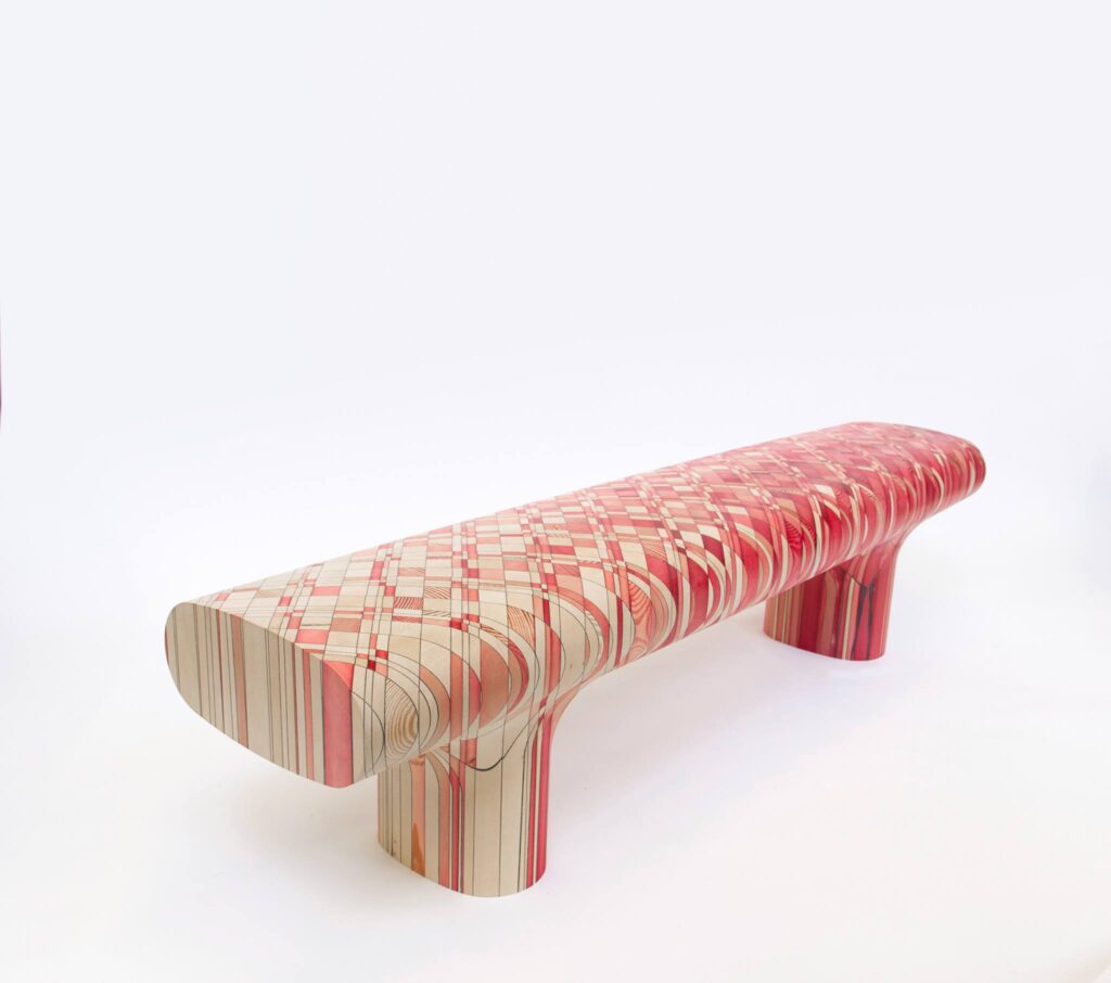Engrain takes this technique and pushes it into graphic construction. Different coloured elements are prepared and then laminated together into a larger block. From there, the form is shaped by carving and milling, revealing the internal colour structure as the object emerges. This is where the collection gets its signature look: a flat grid becomes distorted when it is turned into a three-dimensional volume. The checks stretch around curves, tighten at edges, and shift direction as the shape slices through the layered block. It feels almost like the pattern is moving, even though it is completely static.