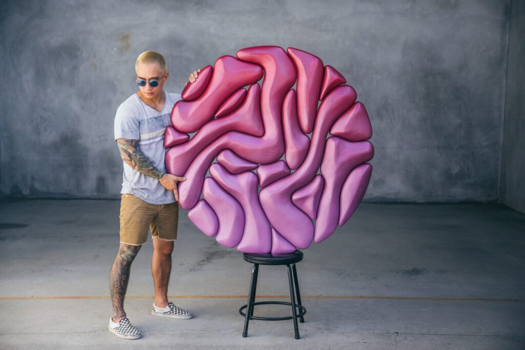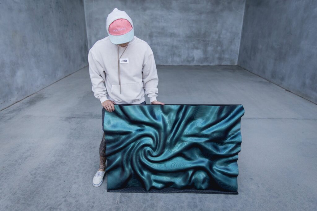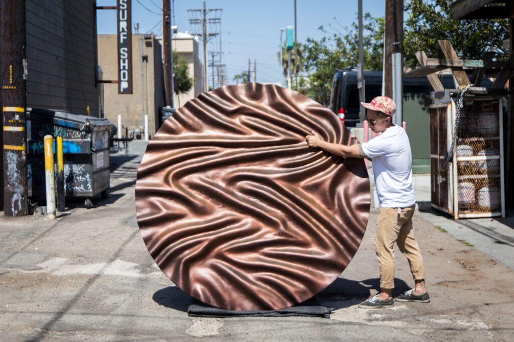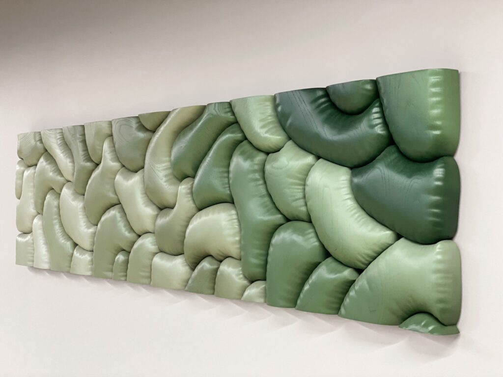 Because he works exclusively with wall art, composition plays a central role in his method. Every curve and negative space has a purpose, guiding the viewer’s eye from one section to the next. The panels often feature layered contours that create subtle depth shifts. When light moves across the surface, shadows stretch and recede, adding another layer of animation. This interplay is one of the reasons his work photographs so well, yet it looks even stronger in person where the gradients feel alive.