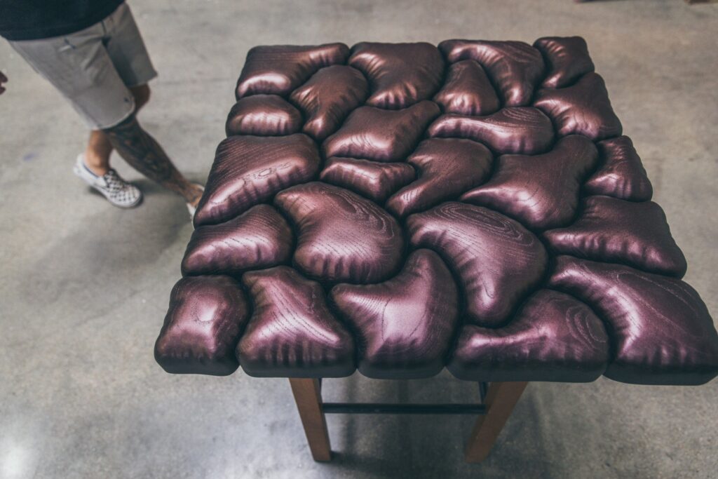 His workflow remains relatively simple, yet he pushes each technique with care. He selects boards for tone, alignment, and stability, then maps out the general flow before carving. While many artists rely on templates, he adapts while working, adjusting forms as the design evolves. This flexibility keeps the pieces from feeling mechanical. Instead, they hold an organic energy that makes even minimal compositions feel expressive.