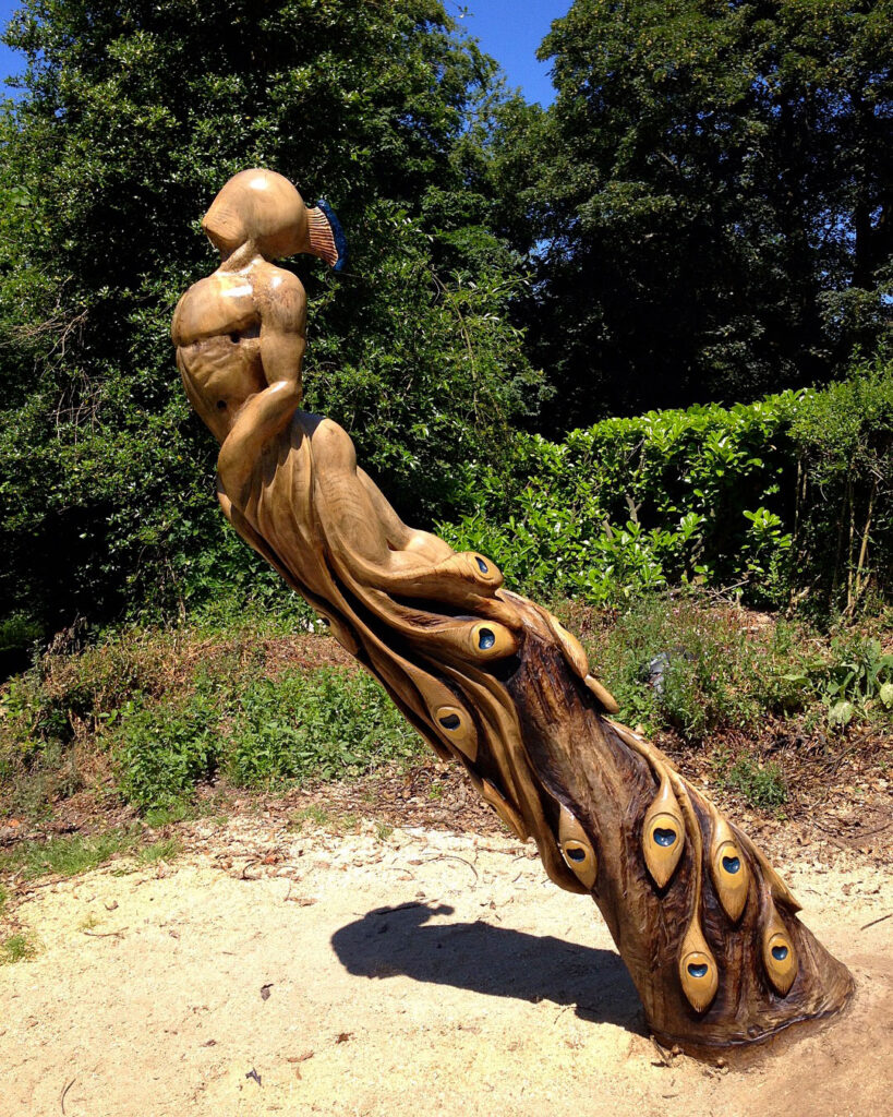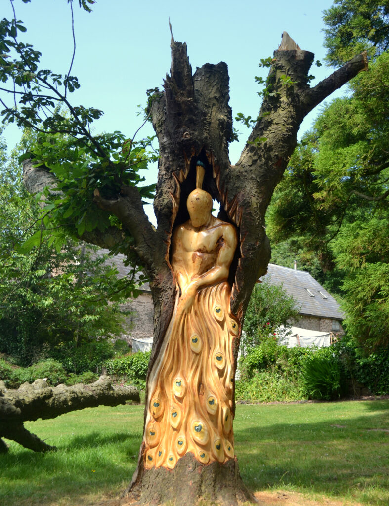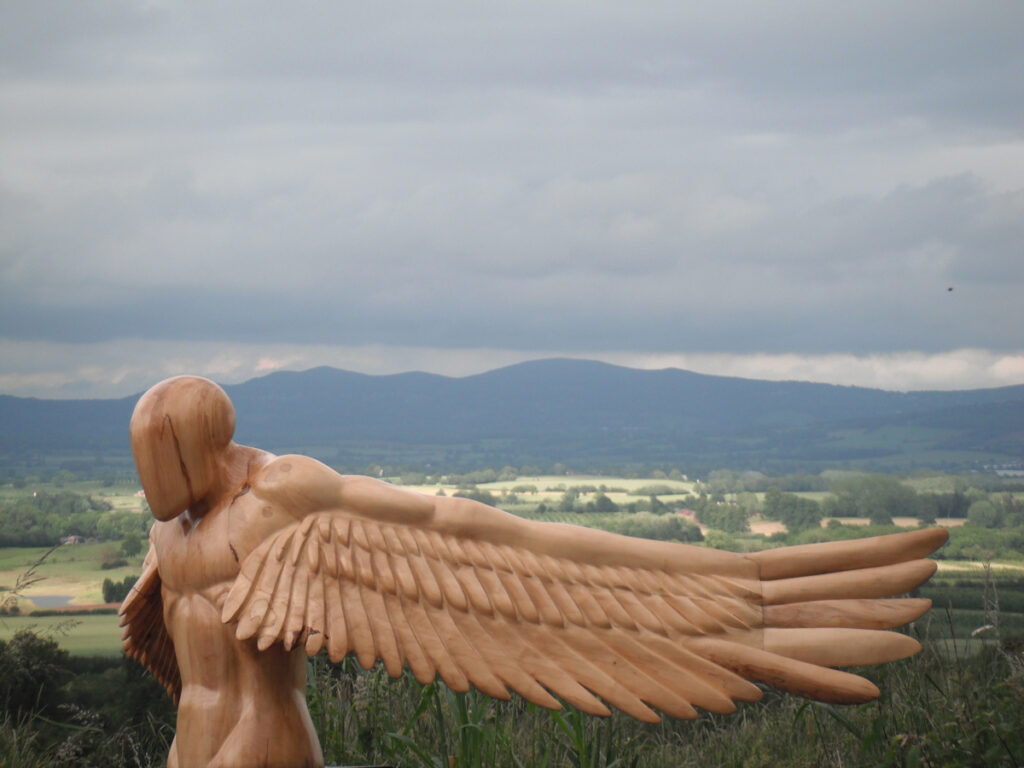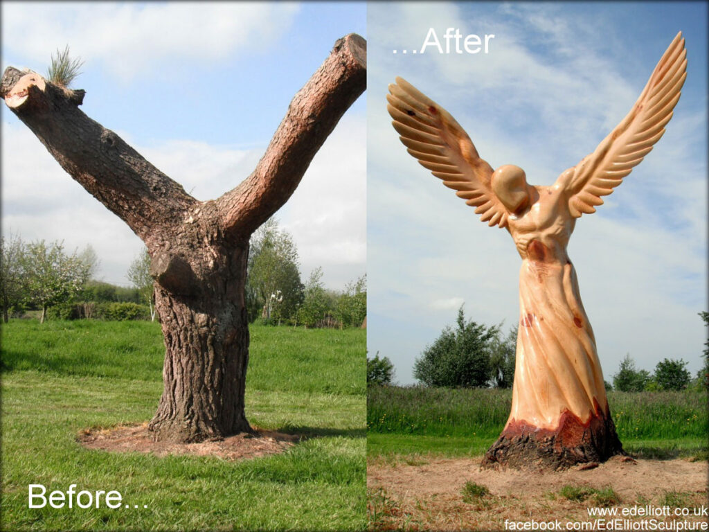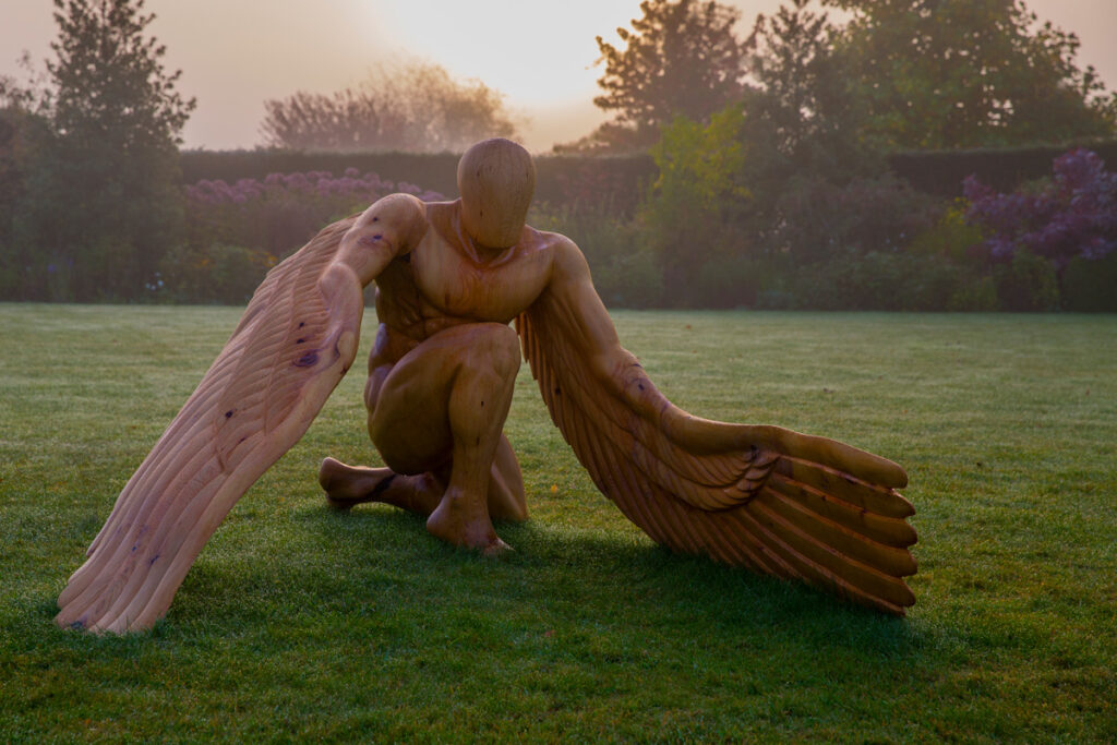 Early visibility came through public commissions. In 2011, Elliott won a commission to create a large wooden angel for the National Trust. That work, titled Greer, was carved from London Plane wood sourced from the Mottisfont Estate and installed at Mottisfont in Hampshire.