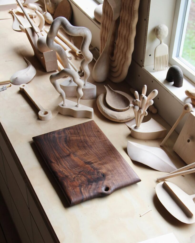 Her color palette is another notable element. Instead of relying on bright stains or paint, she usually keeps finishes natural. Soft oils and waxes bring out the warmth of the grain without overshadowing the pattern work. The result is a restrained, almost quiet aesthetic. It sits comfortably between art object and domestic tool. Her spoons, for instance, often blur the line between sculpture and utility. They look functional, yet their surface detailing turns them into display pieces.