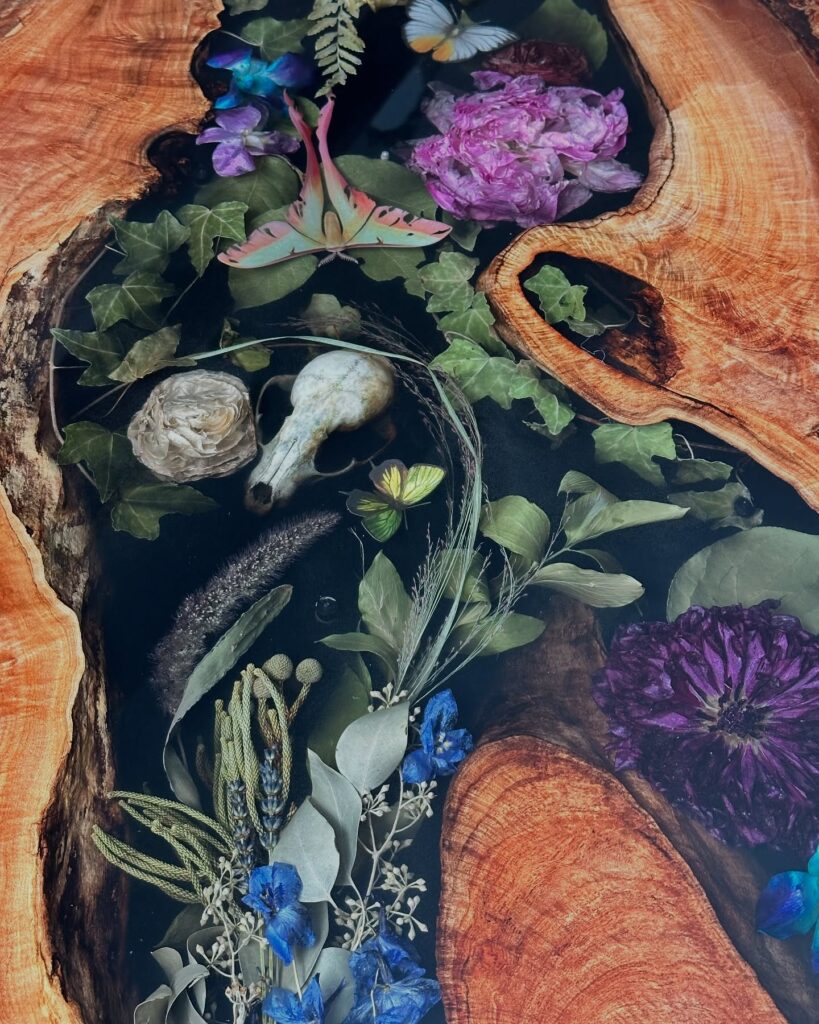 Today, her tables resemble living paintings. The resin becomes a lens, magnifying every petal and vein, while the wood beneath grounds the composition. The contrast between the dark, glass-like surface and the natural patterns of the grain gives each piece a quiet drama.