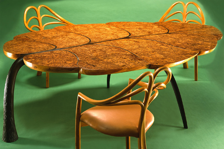 Makepeace’s furniture defies easy categorisation. He pushes both aesthetic and technical boundaries, making ambitious use of lamination and mixing materials freely – wood, leather, metal – while always letting wood take centre stage. His “Column of Drawers” from 1978, with birch and coloured acrylic drawers cantilevered from a stainless steel spine, sits in the Victoria & Albert Museum collection as an example of sculptural storage.