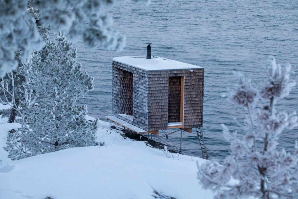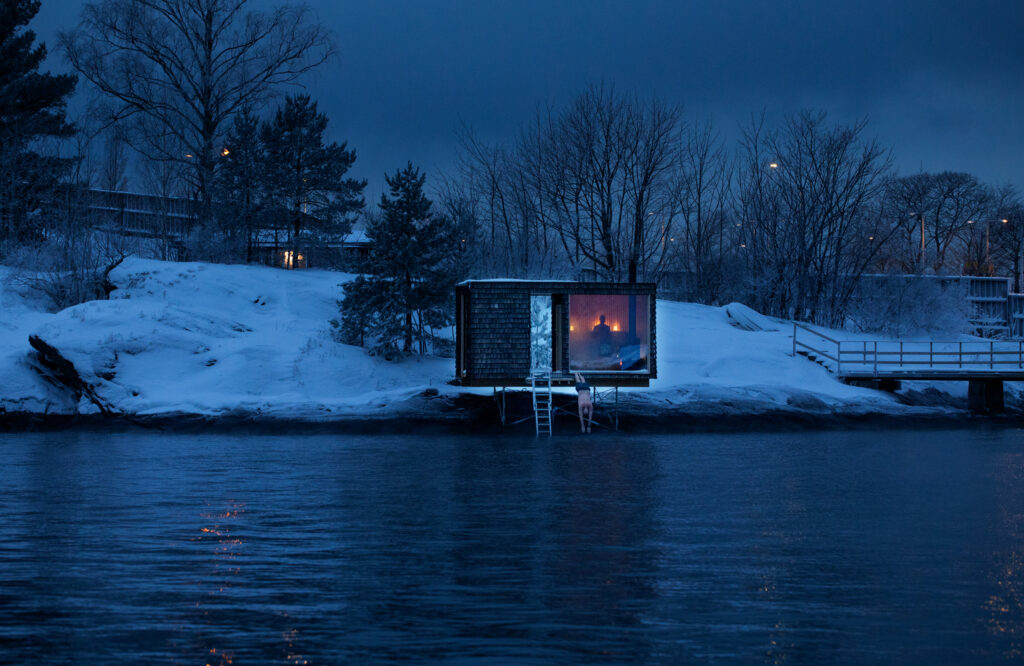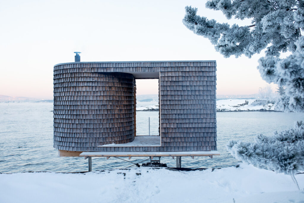Hotspot is meant to sit close to the waterline, where the sea becomes part of the ritual. In the Nesoddtangen version, the sauna is positioned on smooth coastal rock and oriented toward the sunrise, with Oslo visible in the distance. The architecture leans into that horizon. Instead of treating the view as a bonus, the building frames it as the main event, turning the fjord into a constant backdrop for warming up, cooling down, and lingering.