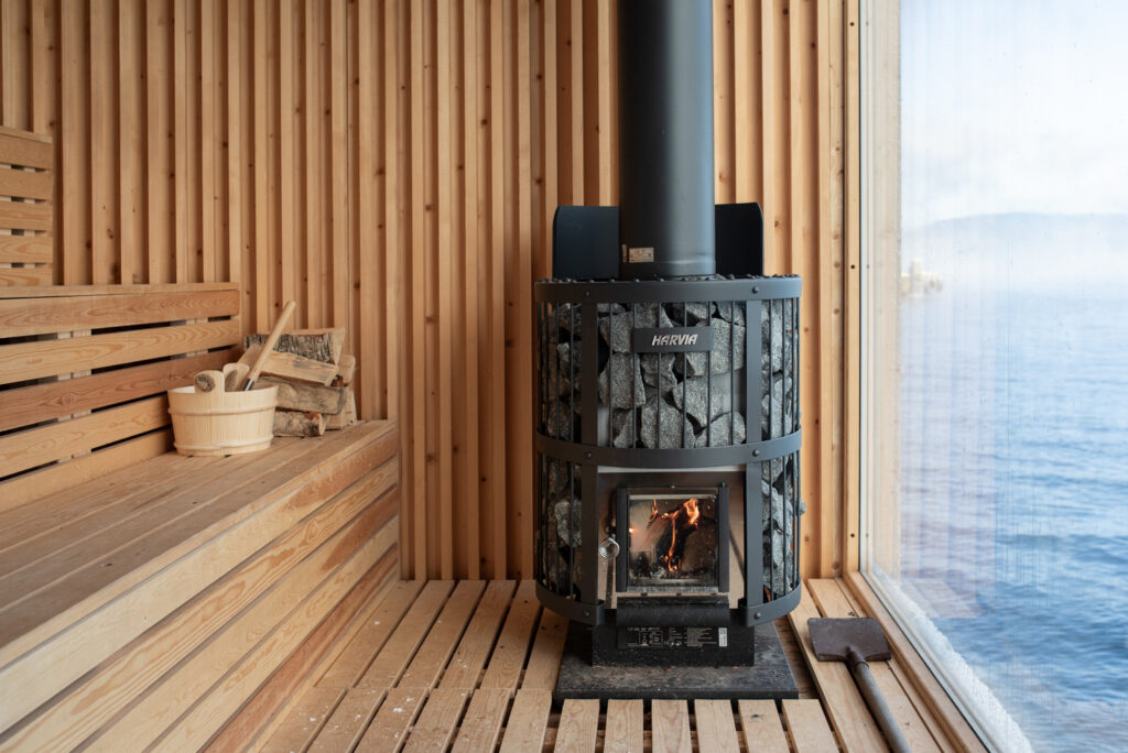 The structure is built in massive timber, used for walls, roof, and floor, creating a stable shell that handles heat and moisture well. Outside, the sauna is clad in pine shingles that are burned and oiled, a finish that reduces maintenance demands while adding a dark, weather-ready skin. The overall footprint is compact – about 16 m² – yet the material choices make it feel solid and permanent, even though the concept is designed to be movable if needed.