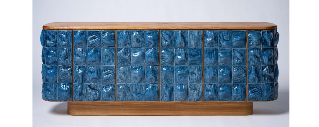 One of their clearest statements is the Surfaced Cabinet series. These cabinets turn the front face into a relief field of individual ceramic tiles, each coming from a different mold so the surface reads like a natural record – fossil-like, uneven, and rhythmic instead of perfectly repeated. The cabinet’s wooden base is built to emphasize grain direction and line, so the piece becomes a conversation between the graphic flow of wood and the topography of glazed ceramic. Versions are produced in different sizes, but the core idea stays the same: storage wrapped in an engineered “skin.”