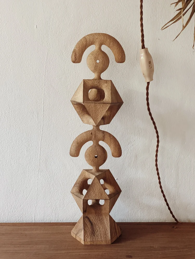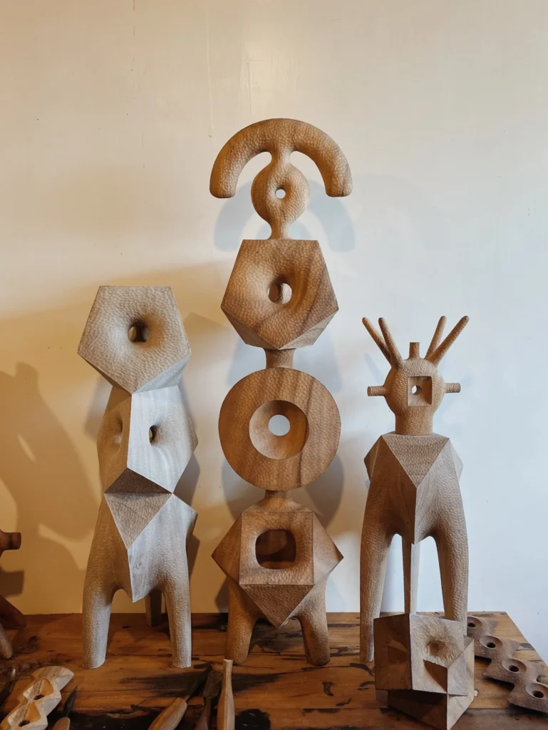 Aleph Geddis carves in a way that makes geometry feel almost alive. His tall totems, compact creatures and portal-like forms look part ancient relic, part science fiction object, all cut from solid blocks of wood with hand tools and a stubborn respect for craft.