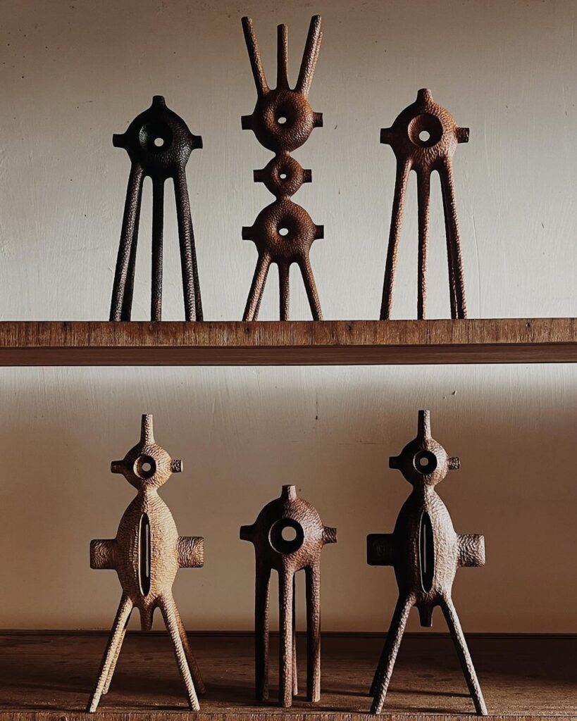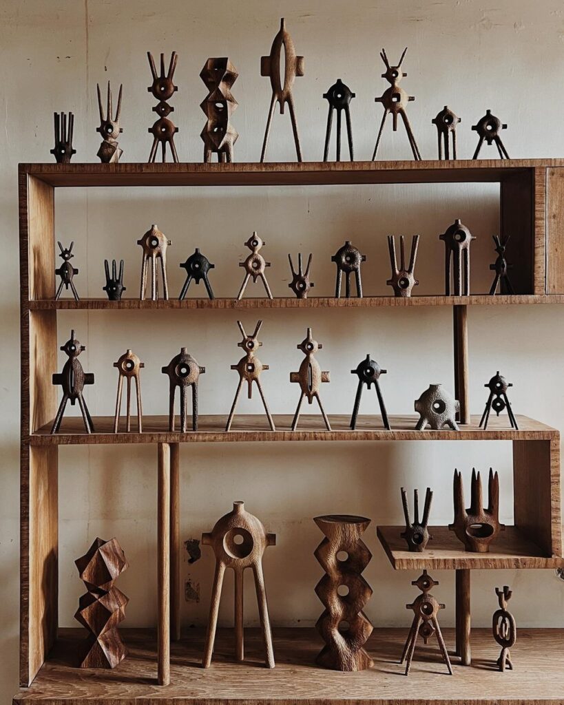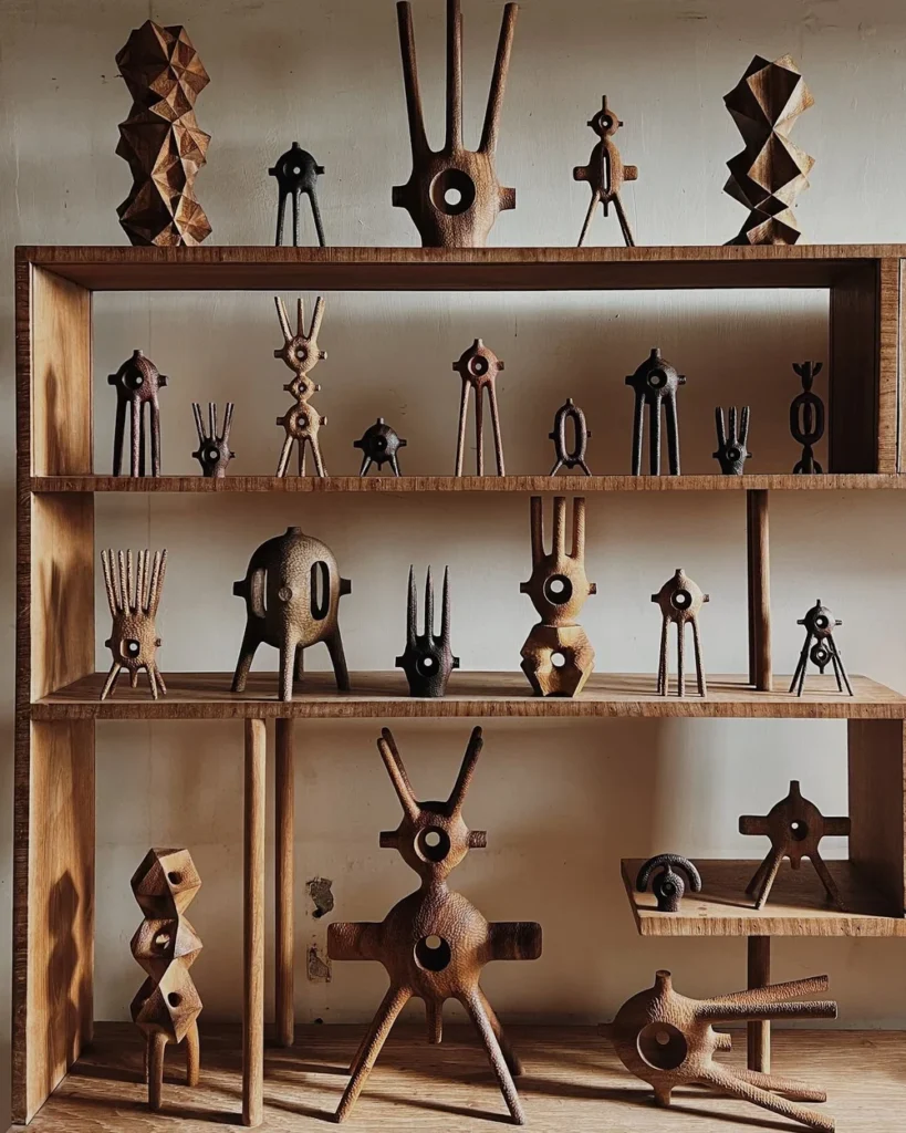 At the heart of Geddis’s practice is an obsession with geometry. Many series focus on Platonic solids and other elemental forms that mathematicians have studied for centuries. He stacks, truncates and pierces these shapes until they turn into totems, towers and hybrid objects that feel both rational and mystical. Some pieces read almost like machines or instruments. Others resemble masks, animals or standing figures, although they never quite settle into a single identity.
