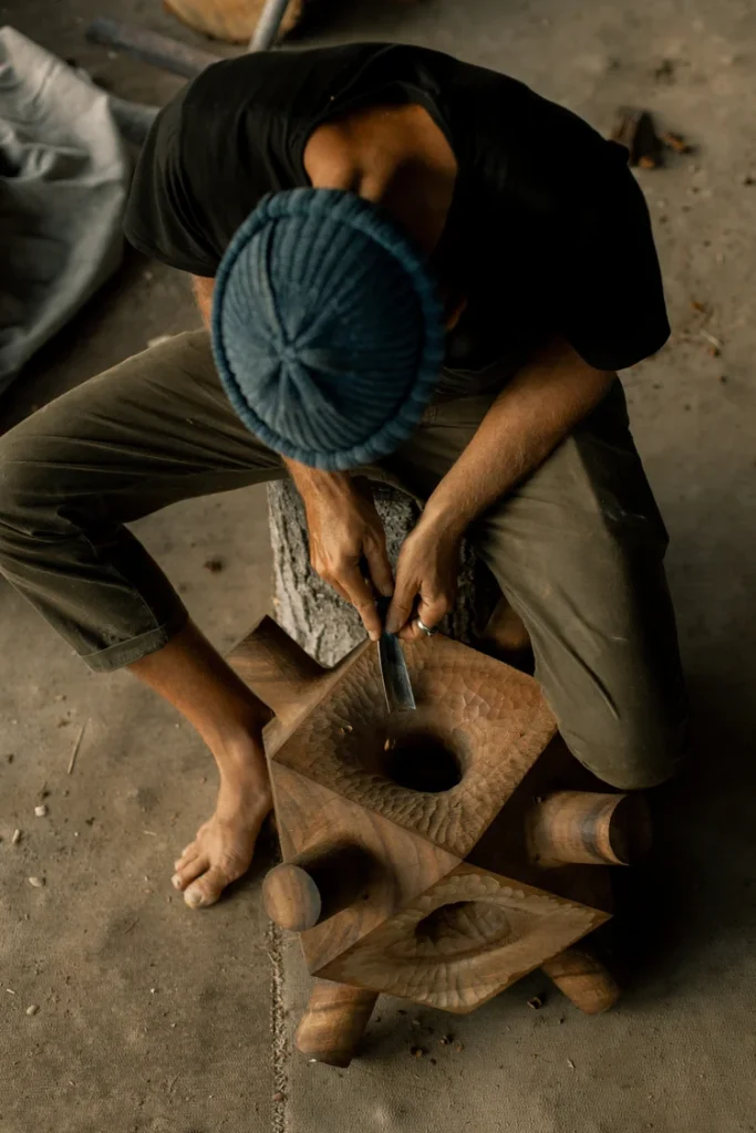 Geography is split as clearly as the forms he carves. Geddis divides his time between the family carving shed on Orcas Island and a studio in Bali, with a newer base in Hokkaido, Japan planned to include its own workshop. Orcas offers quiet, forested isolation. Bali brings dense community and a daily mix of craftspeople, artists and gallery visitors. That movement between places keeps the work from freezing into one aesthetic. The sculptures might express order, but the life around them is intentionally restless.