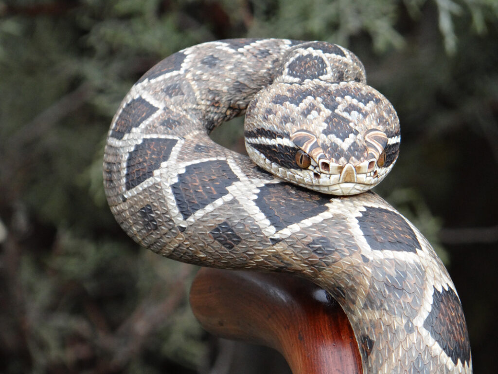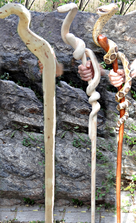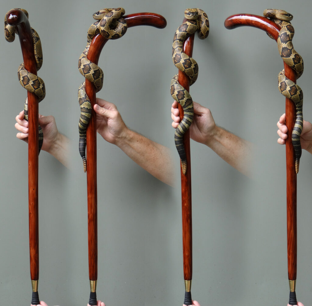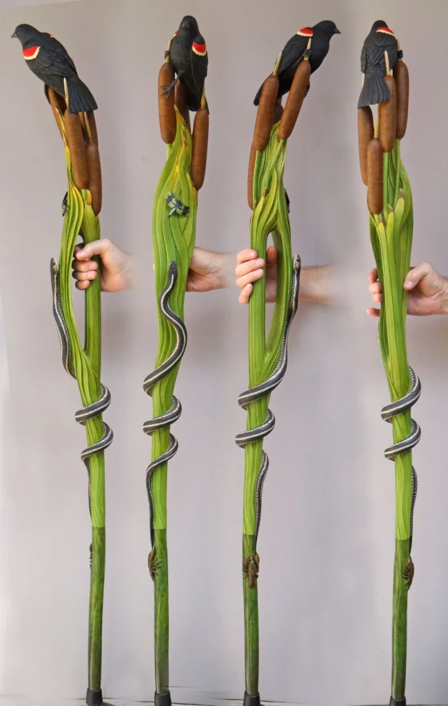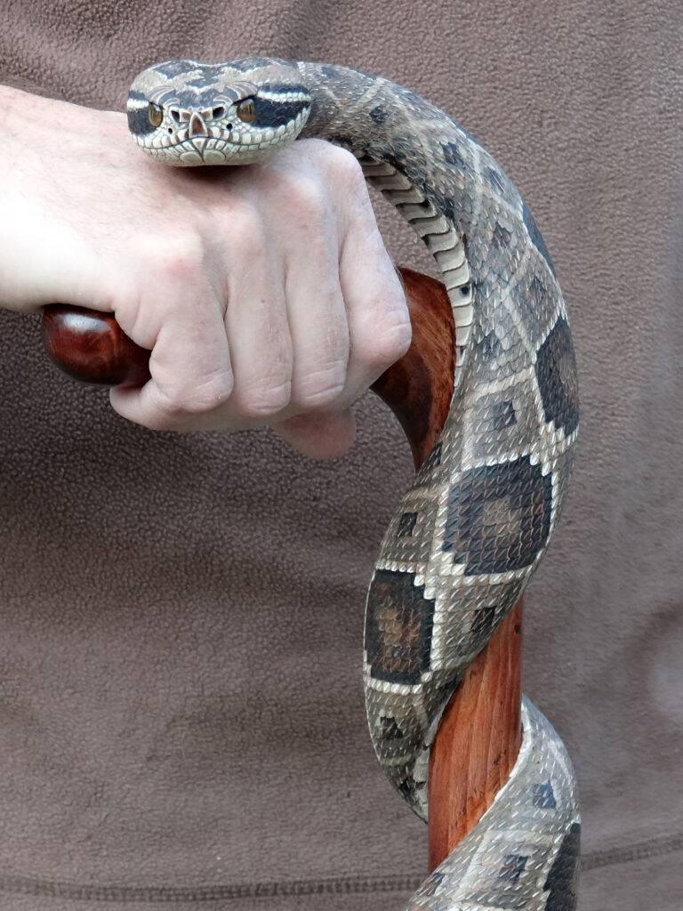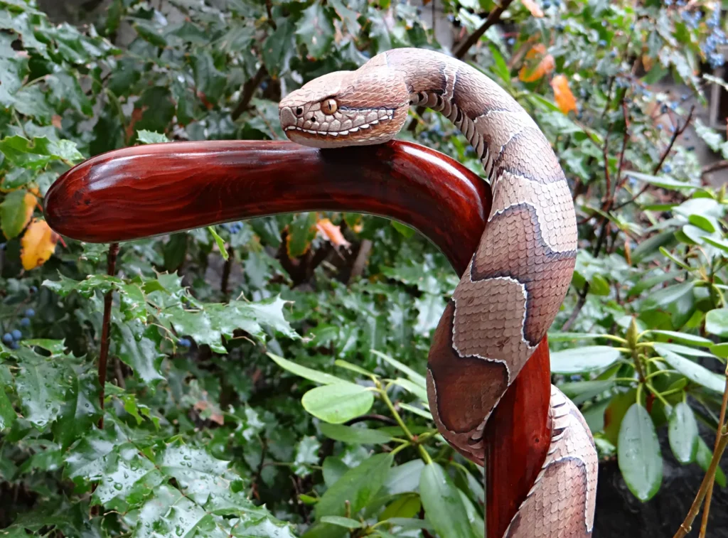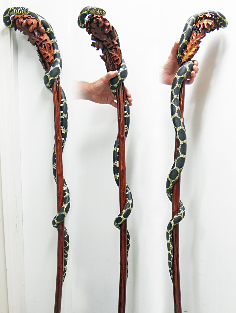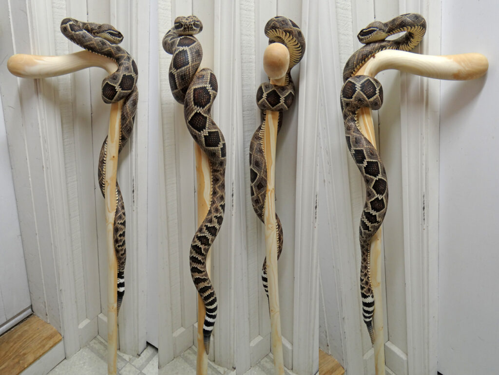 The designs that made his name are his snake sticks, especially rattlesnake and copperhead themes. In many of these, a realistically scaled snake wraps around the shaft in a long spiral, sometimes climbing toward the handle, sometimes posed in a more dramatic “ready to strike” attitude. A key part of the fascination is the illusion that the animal and the stick are one continuous form, not a separate carving attached to a pole.