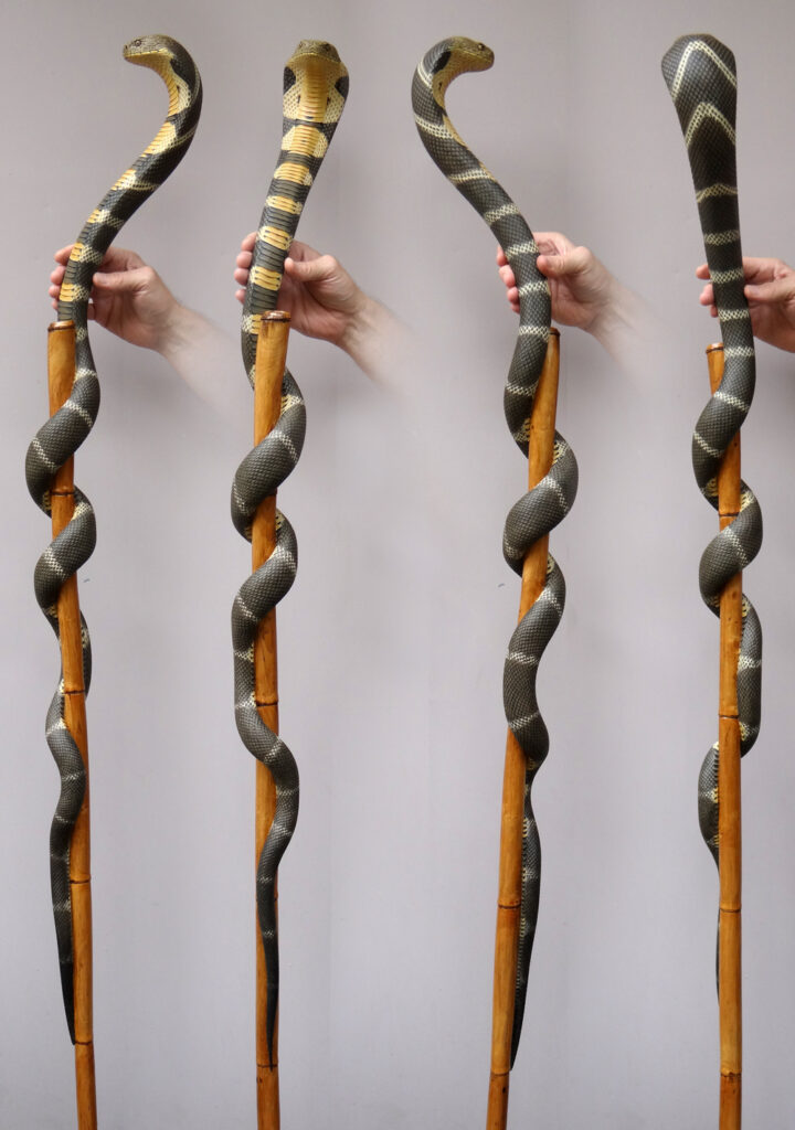That single-piece feel also shapes how the sticks sit in the hand. Instead of perfect symmetry, the staff often follows natural bends and crooks in the wood, letting the original form guide the final composition. The curve becomes part of the story, helping define how the snake moves along the length and where the head, coils, and transitions make the most visual sense.