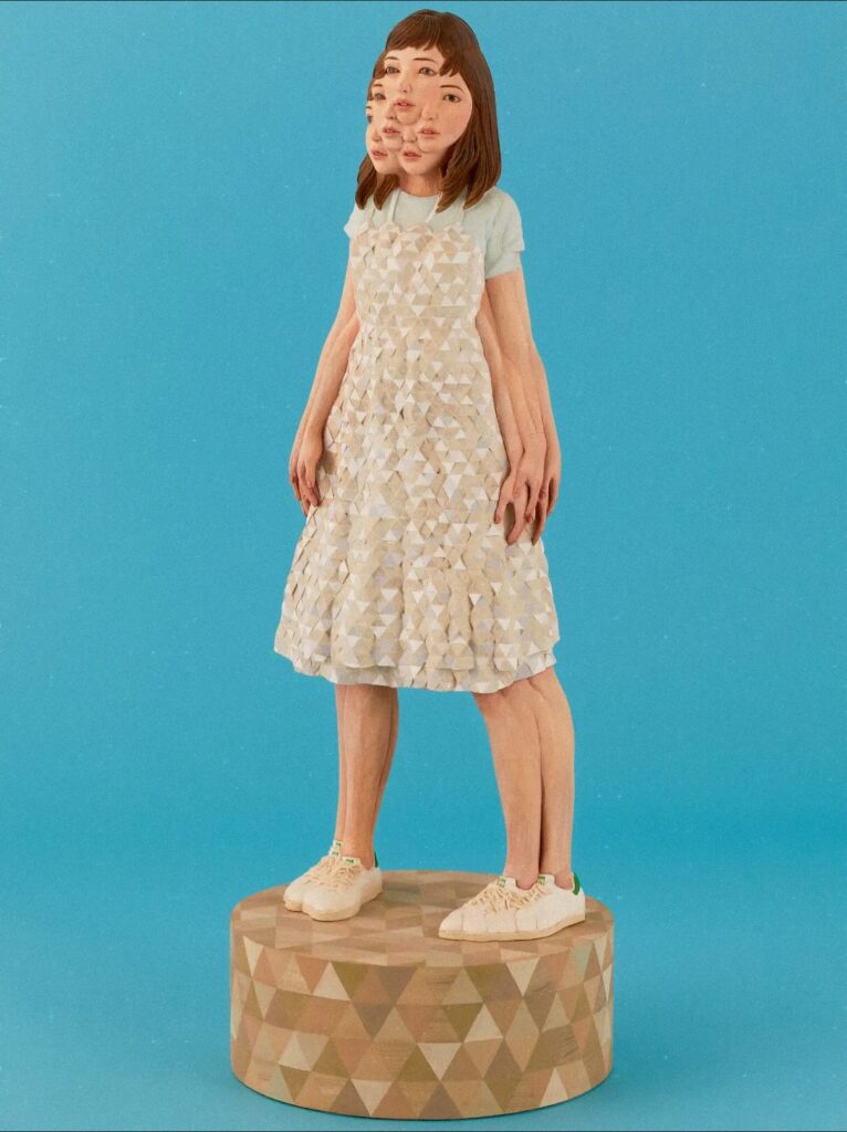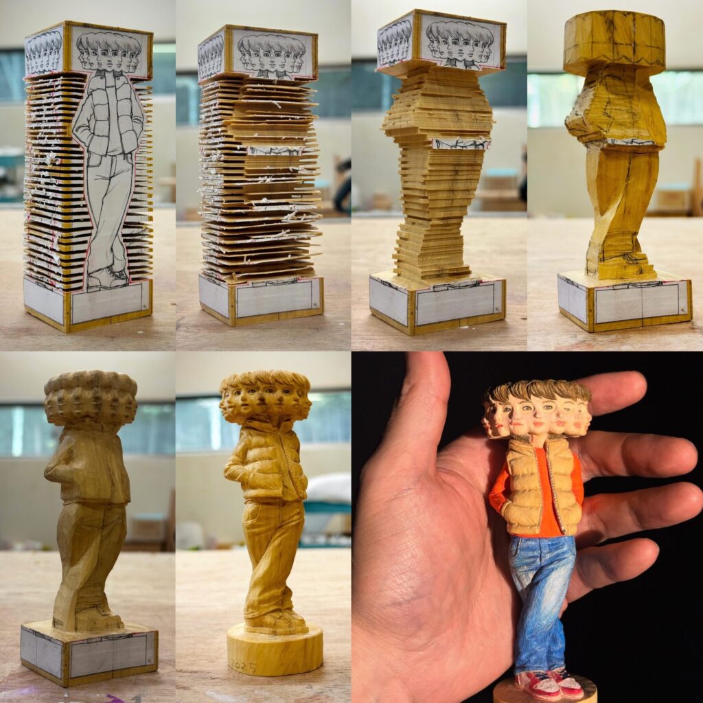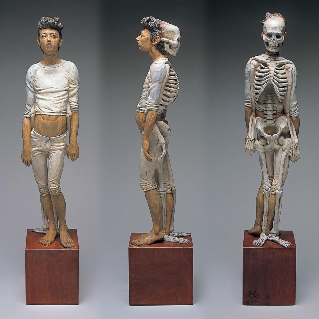 Yoshitoshi Kanemaki is a Japanese sculptor known for figurative wood carvings that feel both precise and disorienting. Born in Chiba in 1972, he graduated from Tama Art University’s Department of Sculpture in 1999. Over the last decade, his work has built a recognizable visual language – life-size bodies, everyday clothing, and faces that fracture into multiple expressions at once.