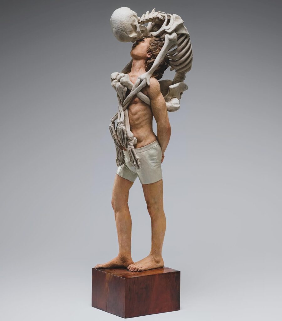 Mortality runs through Kanemaki’s practice as well. Even when the sculptures wear ordinary clothes, the themes drift toward transience – youth as a fleeting state, and the body as a temporary structure. Some works lean into anatomical references, or hint at the skeleton inside the calm surface. Others focus on time in a quieter way, using repeated expressions to suggest uncertainty about what is coming next and what has already slipped away.