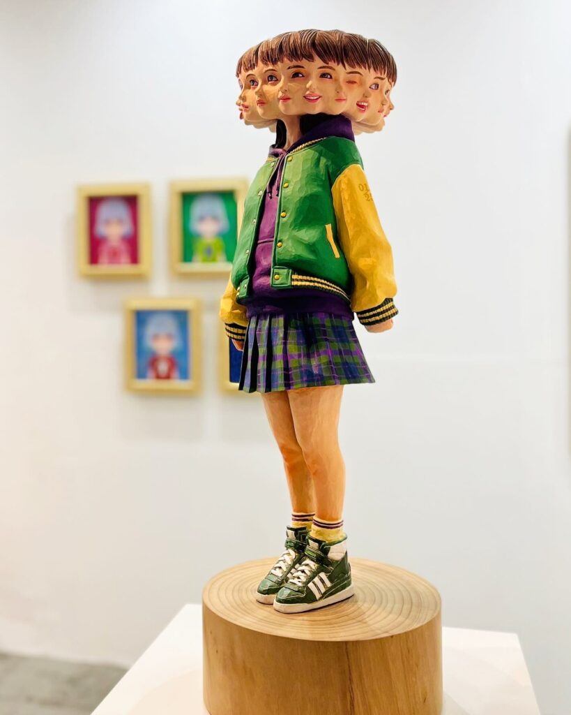 His exhibition history includes solo presentations in Tokyo and beyond, and his work has also crossed into collaborations that put his imagery into a broader design context. Still, the sculptures are built for physical viewing. Photographs capture the shock of the split faces, but the real experience happens when you move around the figure and the “extra” profiles shift. What looks like one person becomes several, and then returns to one again, depending on where you stand.