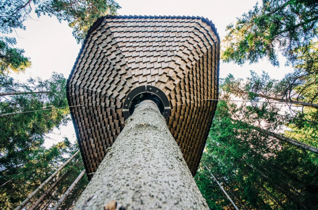 The Originals are suspended about 5-6 meters above the forest floor and fastened to a living pine tree with a steel collar. That single sentence sounds simple, but it is the core challenge: making a guest cabin that feels safely anchored while still respecting that the “column” is alive. Helen & Hard’s solution is a hybrid of timber craft and precise steel engineering, with the tree trunk treated as an essential part of the load path.