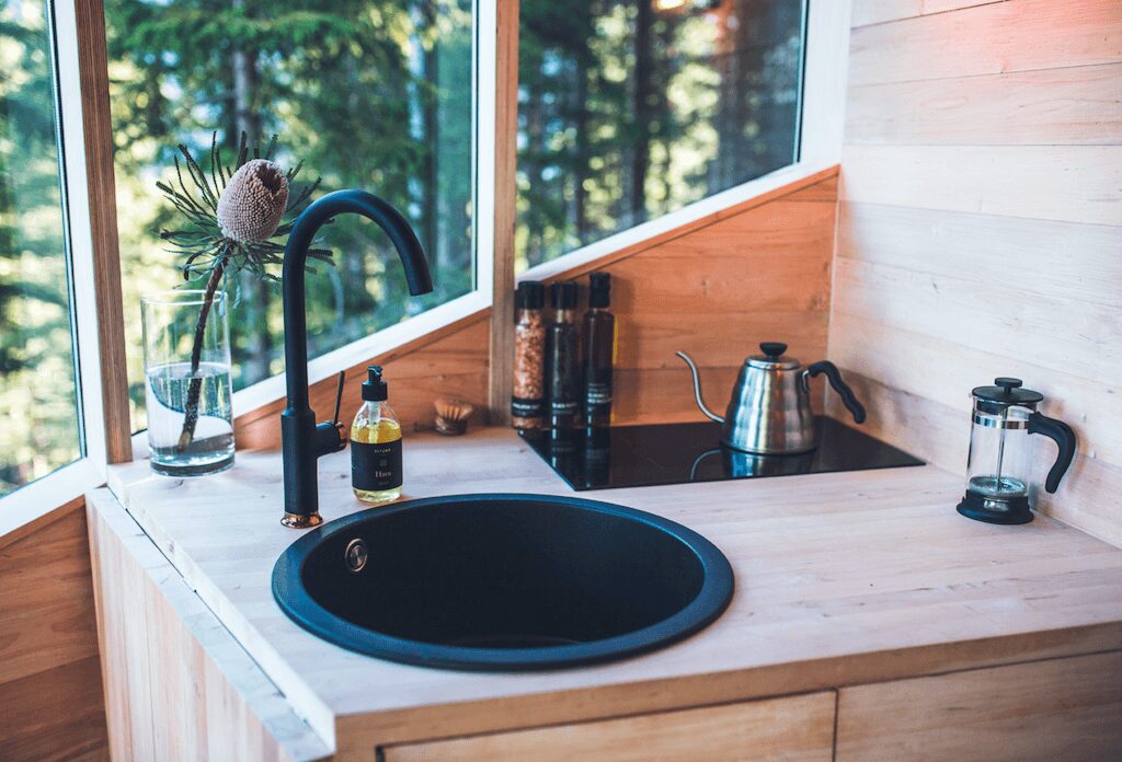 The cabins are equipped for overnight stays with an indoor toilet and shower, plus a compact kitchenette setup. In other words, the “treehouse” label is accurate, but the living standard is not rustic cosplay.