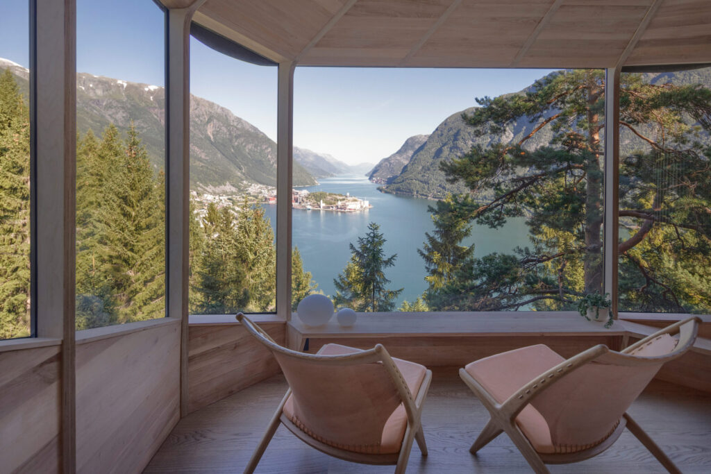 Each Original is only about 15 m2, organized around the central trunk. Within that footprint, the plan includes four sleeping places, a bathroom, a small kitchen area, and a living space that faces the view through the trees toward the fjord and mountains beyond. The result is a tiny interior that avoids feeling cramped, mainly because the perimeter is treated as built-in furniture and the window wall does heavy lifting psychologically.