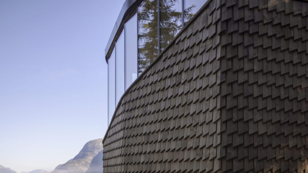 Material choices are unusually disciplined. Outside, the shell is clad in heartwood pine shingles intended to weather and blend into the forest patina over time. Inside, black alder panels warm the room and soften the contrast between the engineered ribs and the organic trunk. It is a tight palette, but it suits the concept: one tree on the inside, many trees on the outside, and timber doing the talking everywhere in between.